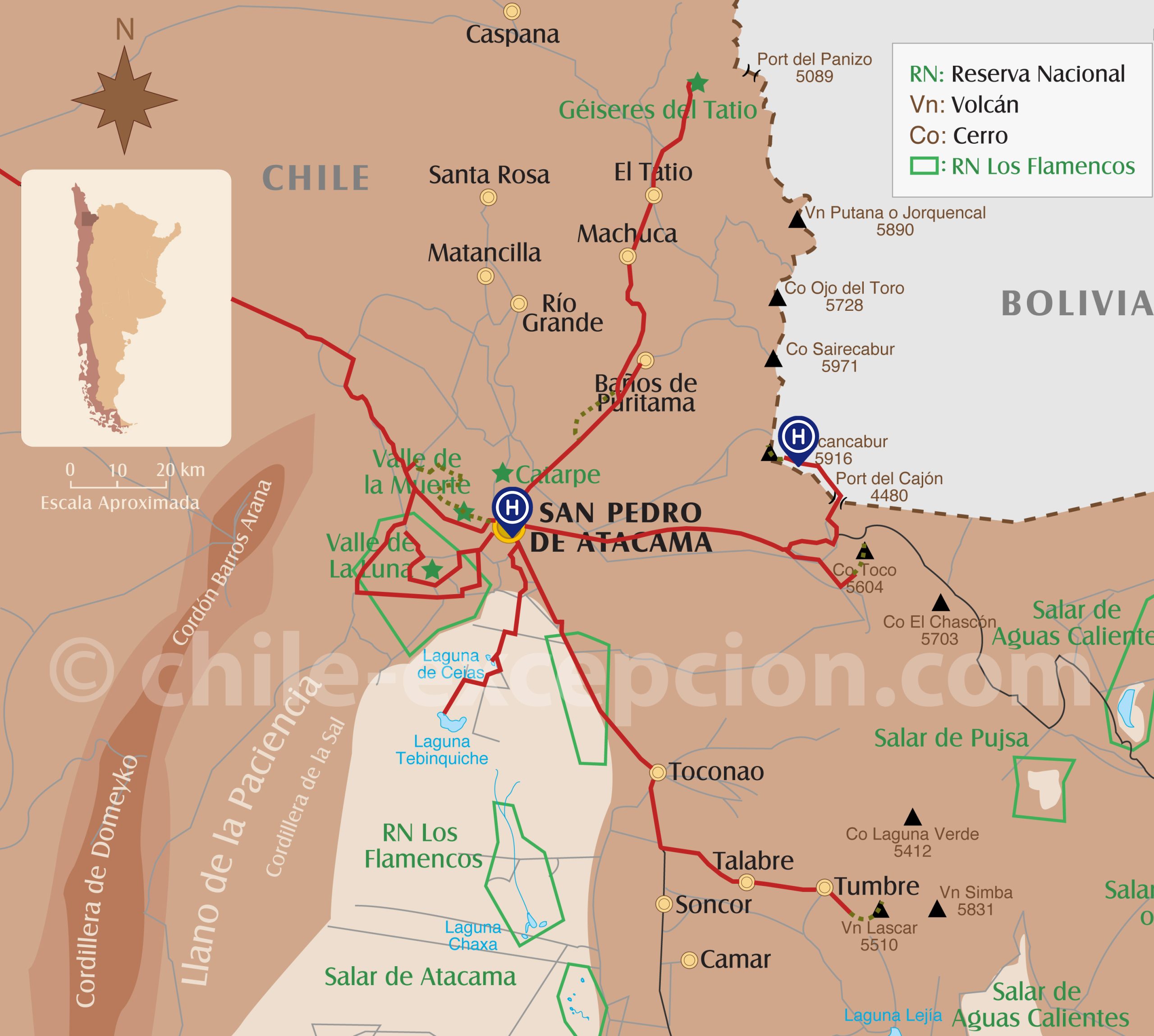 DISTANCES et DURÉES EN AUTO : 22 km / 30 minutes de San Pedro a Guatin. Et retour. Cejar est à 12 km au sud de San Pedro. La lagune Tebenquinche est à 10 km au-delà des lagunes Cejar. Le musée Météorite est situé immédiatement au nord du centre-ville.