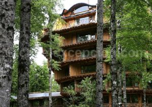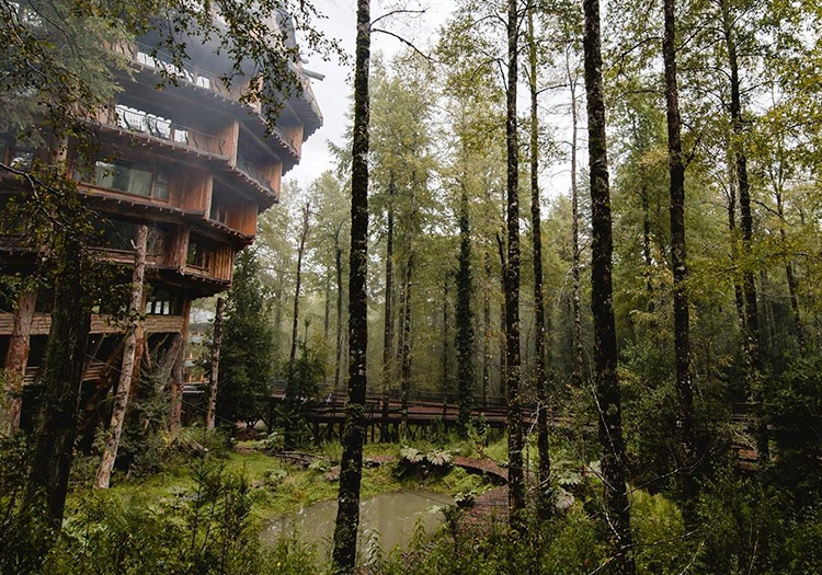 Les chambres d’un grand confort sont distribuées sur 7 étages, accessibles par un ascenseur panoramique ou une rampe en pente douce, qui circule à l’intérieur de cette conception très spéciale. Au sommet, un panorama à 360° offre une vue spectaculaire sur le Volcan Mocho Choshuenco, la magnificence de la forêt et l’immensité des Andes Patagoniques.
