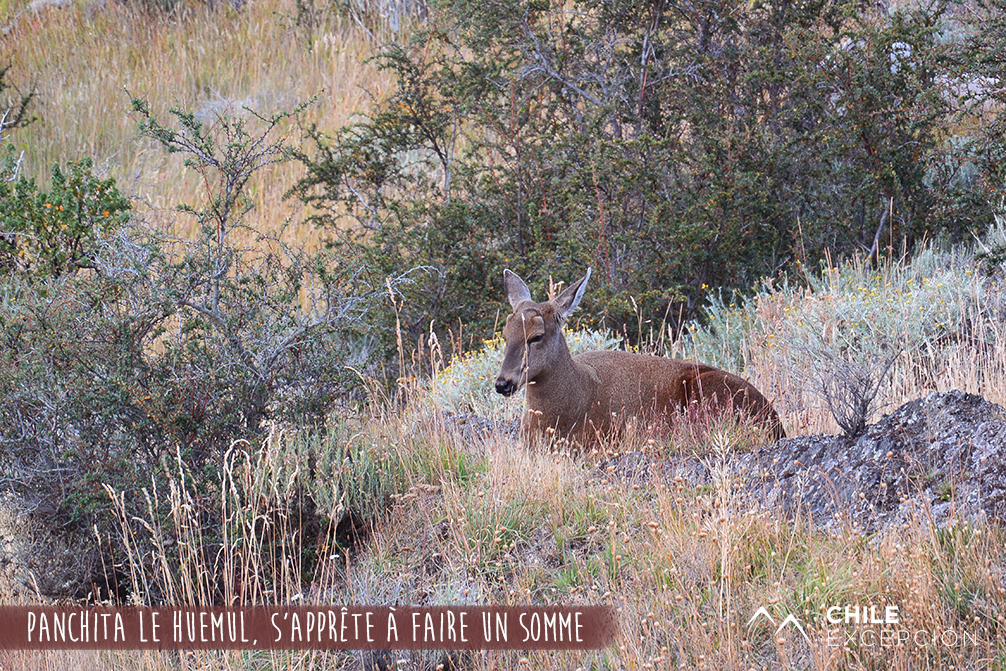 Le jour suivant, nous faisons la connaissance de Yara et Anaïs, nos guides pour la journée, et partons avec elles pour une visite du centre du parc. Au premier mirador où nous nous arrêtons, le Salto Chico, nous découvrons un animal rare : une femelle huemul, en balade matinale près de l’un des nombreux lacs. Le huemul, c’est une sorte de cerf andin. Il s’agit d’une espèce protégée endémique du Chili et de l’Argentine, malheureusement en voie d’extinction. Il figure aussi sur l’emblème national chilien, aux côtés du condor. Anaïs nous raconte l’histoire de ce huemul-là, baptisé Panchita. Lors du grave incendie de 2011 qui a dévasté une importante partie du parc, elle s’est réfugiée dans cette zone. Peu à peu habituée aux humains et rejetée par ses congénères (peut-être pour cette raison), elle erre désormais dans ce périmètre, et se laisse observer assez facilement. Nous avons du mal à partir, nous aimerions rester là, à la regarder. Elle est tranquille, son regard est doux et ses mouvements lents. Sur son pelage uniformément brun, nous remarquons des cicatrices, souvenirs d’une malheureuse rencontre avec un puma. Elle se couche et ferme les yeux, pour une petite sieste au soleil.