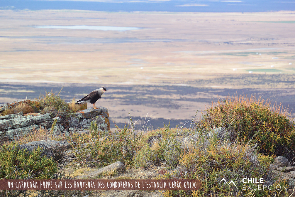Le lendemain matin, nous quittons l’hôtel de l’estancia Cerro Guido, pour nous rendre avec Séverine, l’une des guides, à un endroit appelé Condoreras. Elle nous explique que cet endroit fait partie de l’estancia. Il s’agit en fait d’une barre rocheuse haute de 200 mètres, qui offre une vue époustouflante sur le massif du Paine, et sur la vallée de la rivière Las Chinas. Surtout, elle doit son nom au fameux condor des Andes, qui y niche. Effectivement, quelques minutes après notre arrivée au sommet de la falaise, trois petits points à l’horizon se rapprochent, longent le promontoire où nous nous trouvons, et passent exactement au-dessus de nos têtes. À ce moment-là, on entend un son unique : celui de l’air qui glisse sur leurs ailes. C’est comme si un petit planeur passait à côté de votre oreille. Nous restons un moment à observer ces condors aller et venir à quelques mètres de nous.