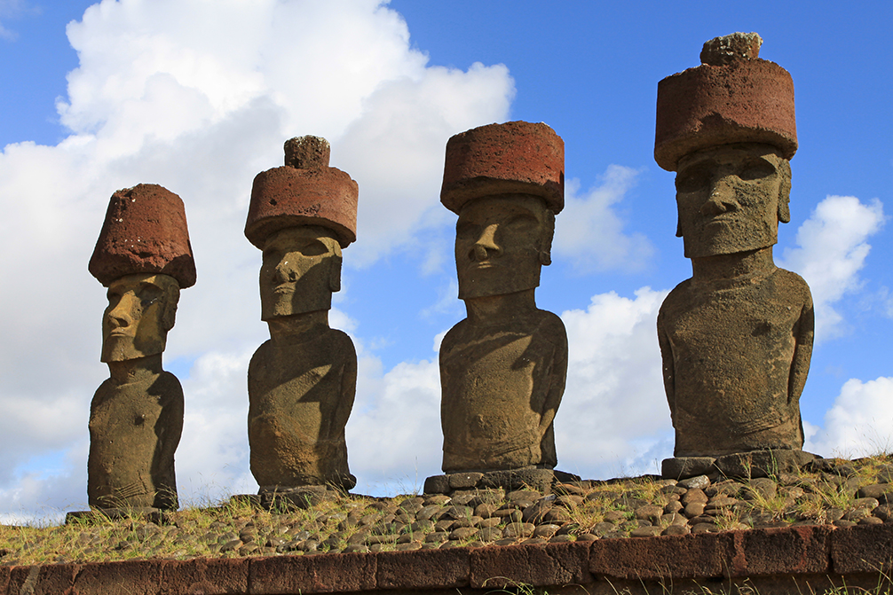 Le volcan Rano Raraku, célèbre dans l’histoire de leur construction, est l’un des sites archéologiques les plus extraordinaires de la planète. Son cratère empli d’une lagune et ses flancs verdoyants masquent l’ancienne carrière des moaïs. Sur l’ensemble de l’île de Pâques, il s’agit du site où l’on rencontre le plus grand nombre de ces géants de pierre.
