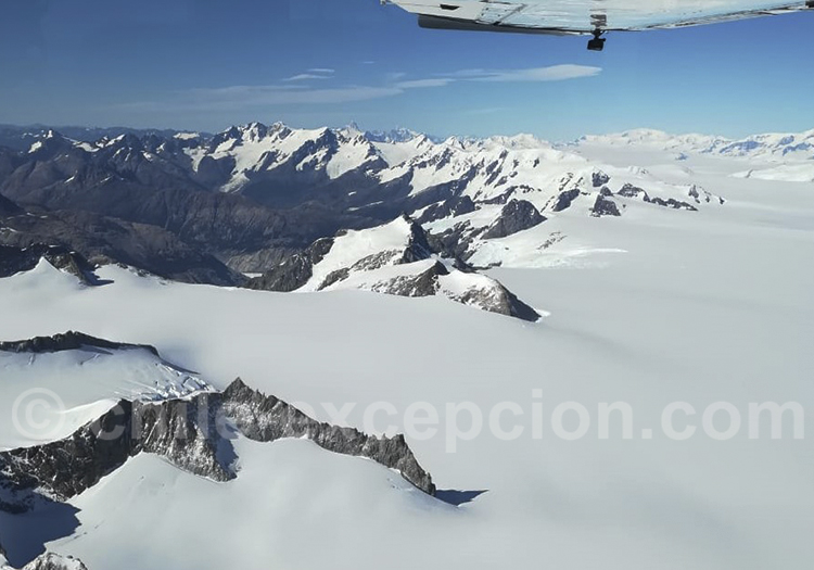 Une gigantesque masse de glace couvre le Sud du Chili, constituant une des principales réserves d’eau douce de la planète et donnant naissance aux glaciers. Dans la XIe Région d’Aysén, le champ de glace Nord couvre une superficie d’environ 4200 km² et s’étend sur 120 kilomètres du Nord au Sud et 40 de large. Dans la XIIe Région de Magallanes, le champ de glace Sud est à cheval entre l’Argentine et le Chili sur 22 000 km² environ, l’essentiel au Chili, et s’étend sur 350 kilomètres du Nord au Sud et 50 de large. Comme exemples de glaciers au Chili, il y a le glacier Pío XI (le plus grand de l’hémisphère Sud), le glacier Balmaceda, le glacier Serrano et le glacier Grey. Le champ de glace est protégé par des parcs naturels : parc Bernardo O’Higgins et parc Torres del Paine au Chili, parc Los Glaciares en Argentine.
