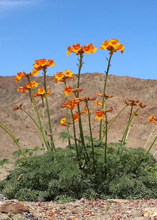 Ces fleurs s’éparpillent sur le sol de la cordillère des Andes jusqu’à l’extrême nord du désert, formant un joli tapis de feuilles vert foncé, crénelées, en grappes, et de fleurs d’un beau jaune orangé. Elle est plus commune en Argentine.