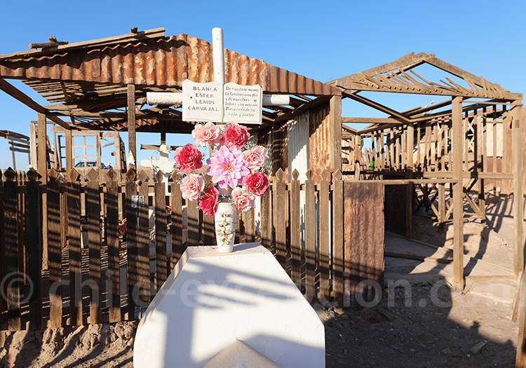 • Tombe fleurie au cimetière Pampino de Victoria, village minier du désert d'Atacama